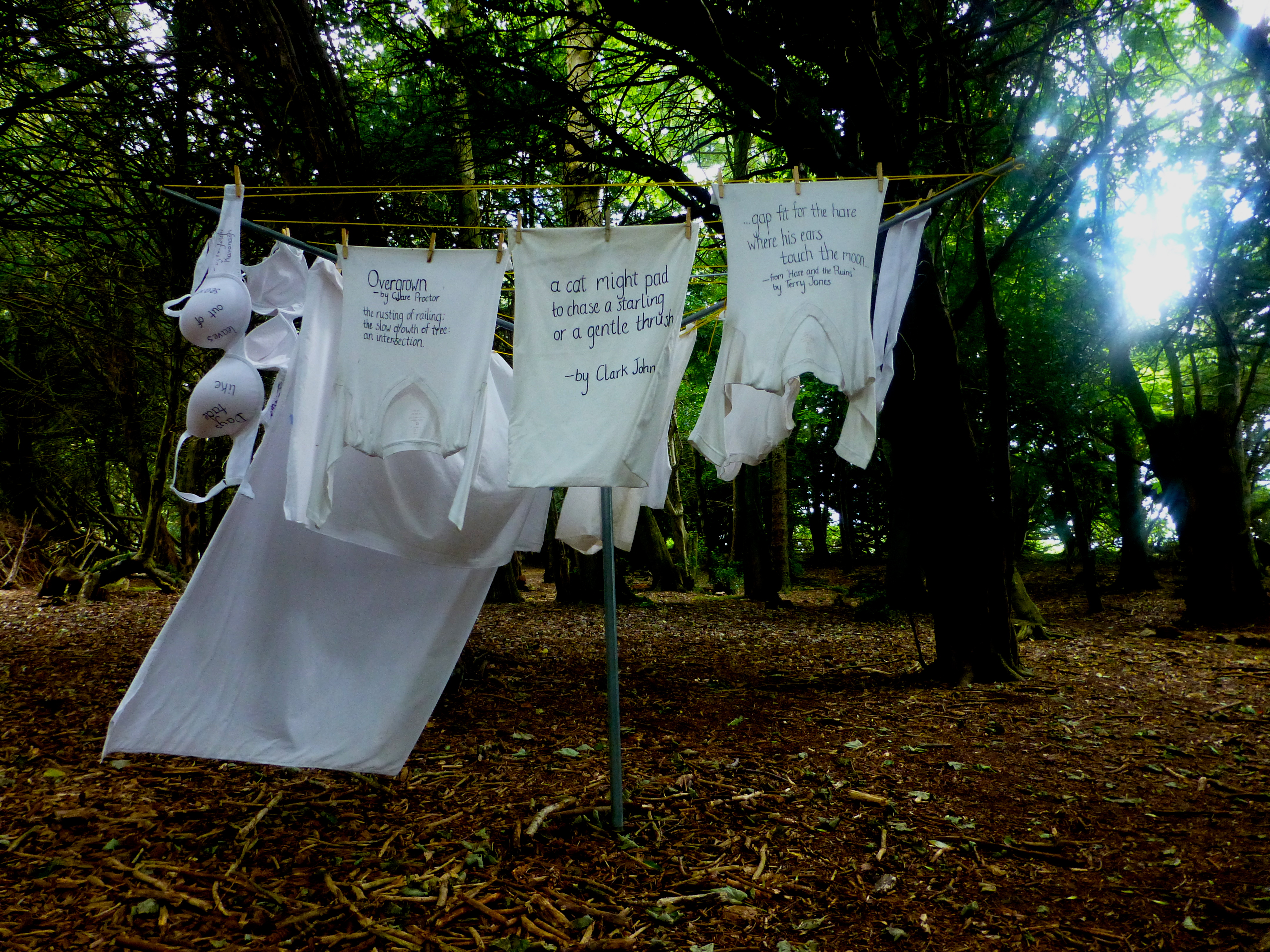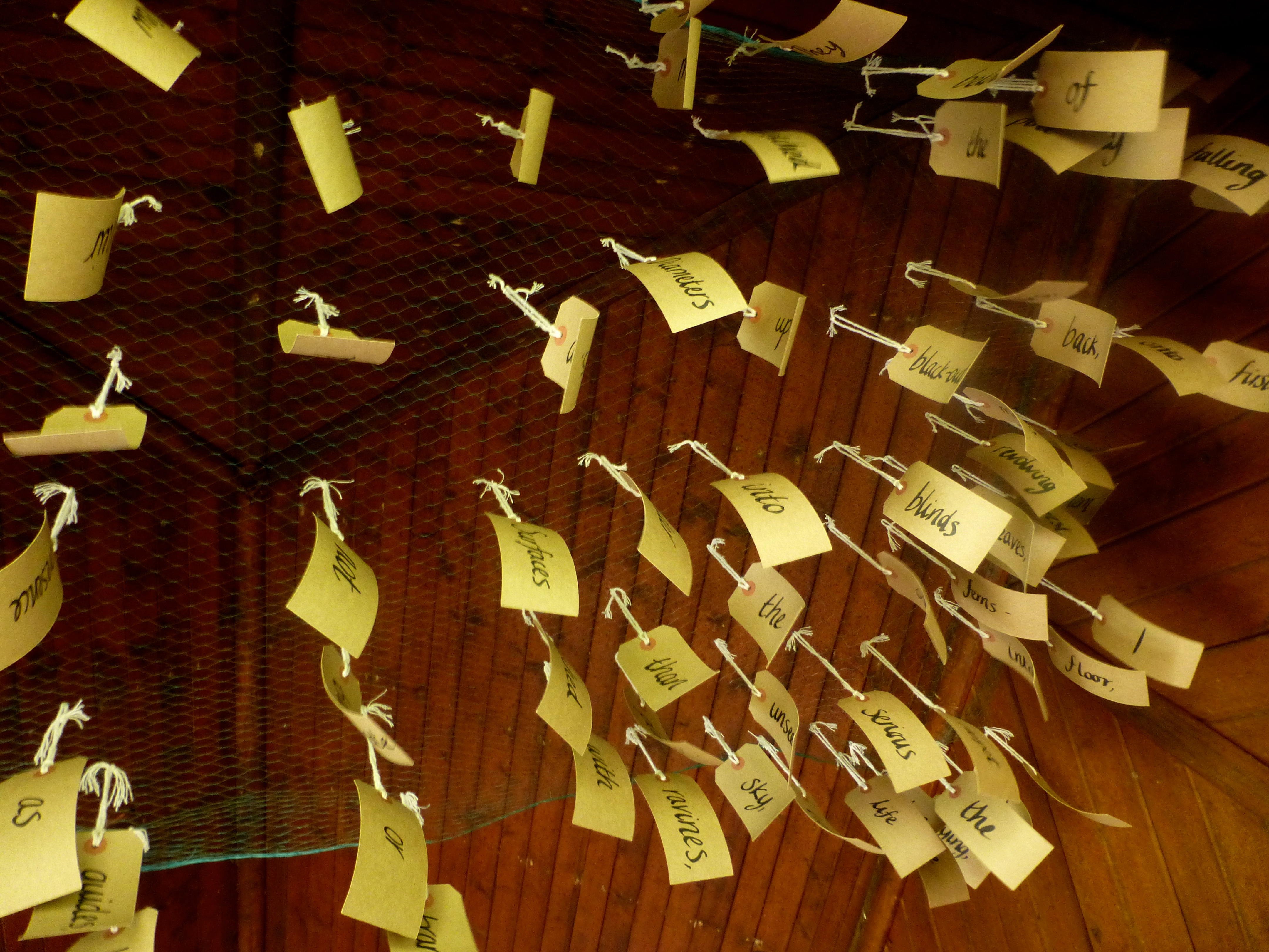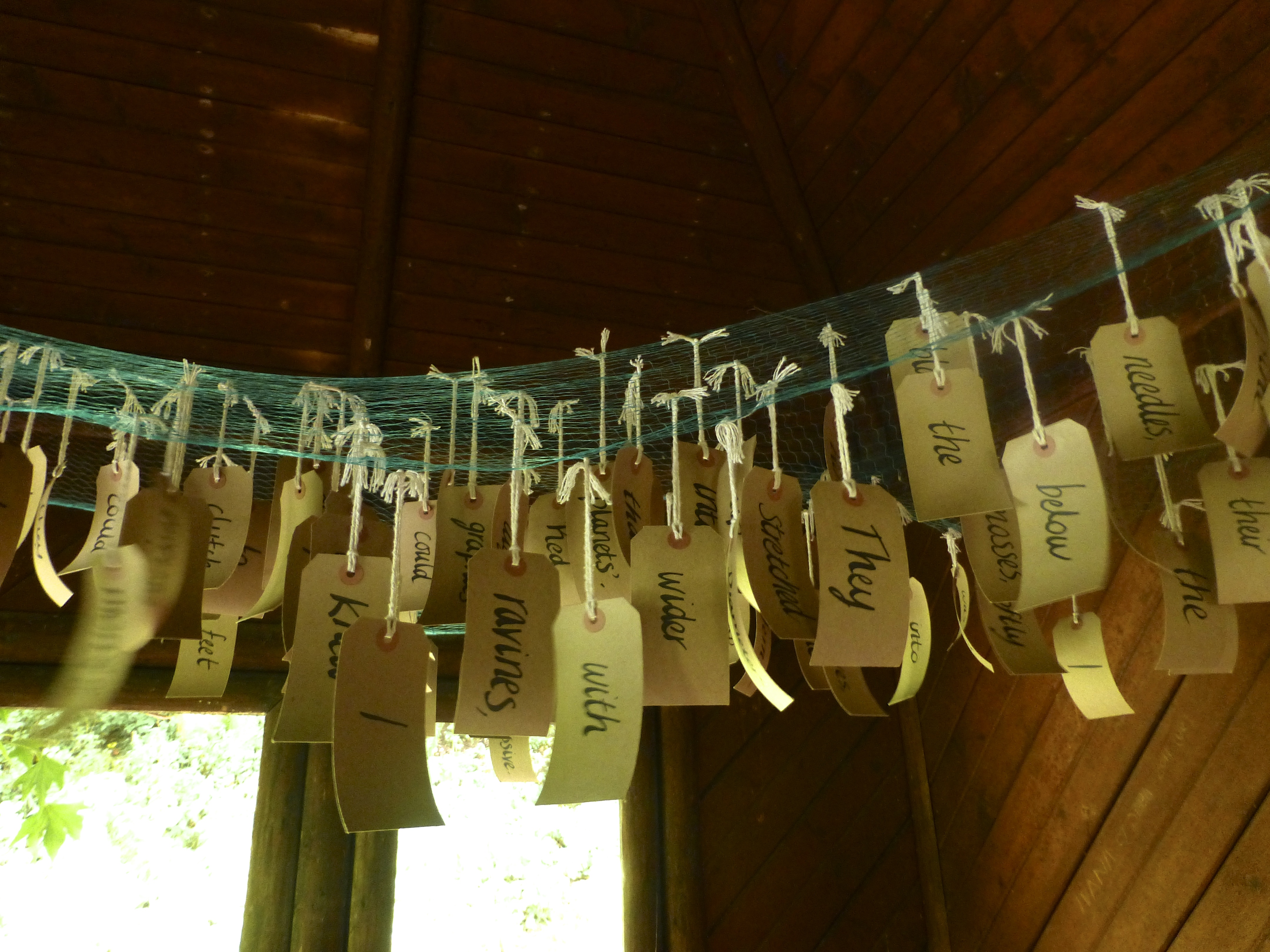 Poems spun on a clothesline; dangled from the branches of trees on small coloured boards like charms.