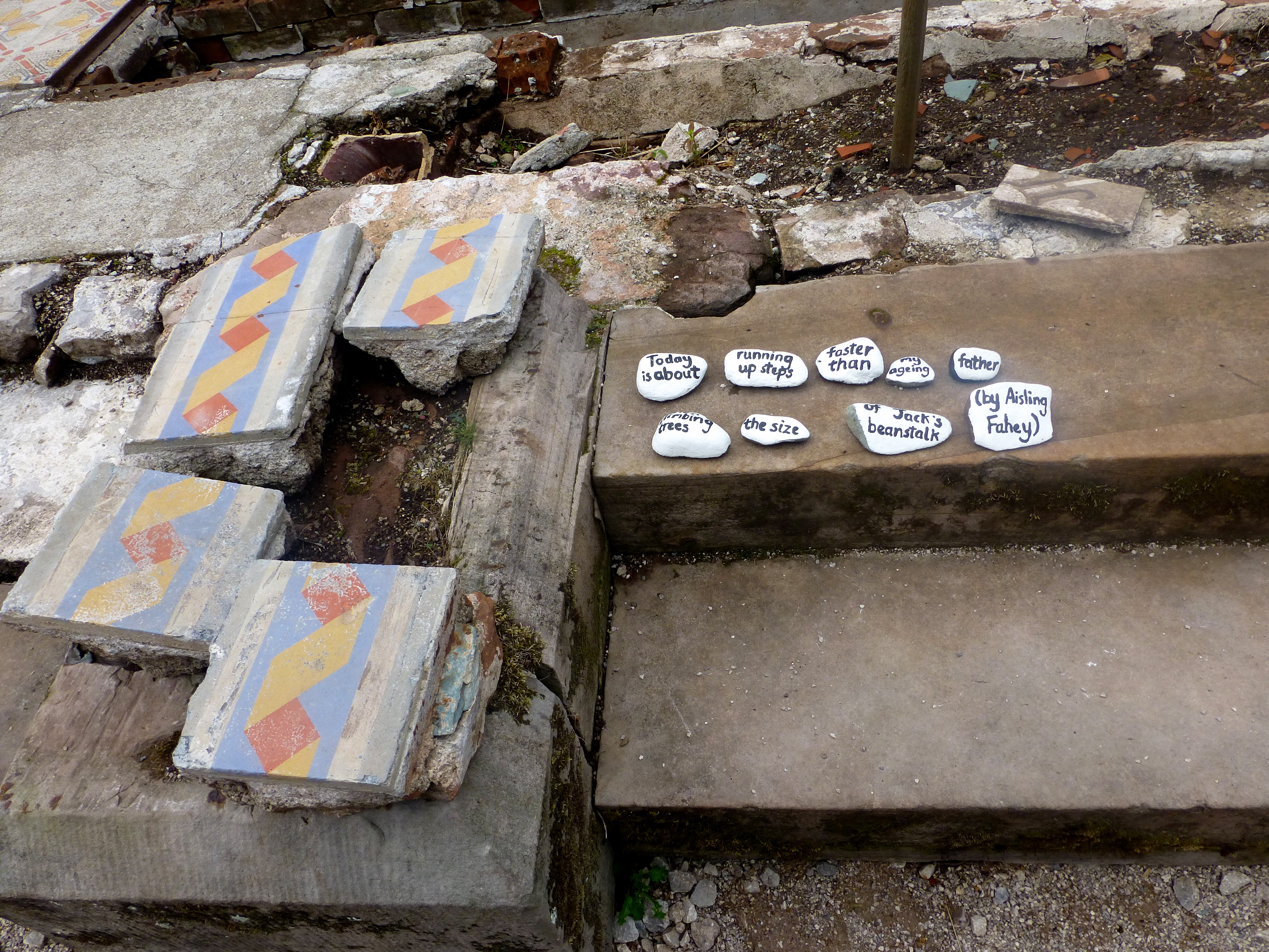 Back by the castle itself, we found poems on pebbles, laid out by the collected parts of a semi-shattered tiled floor.