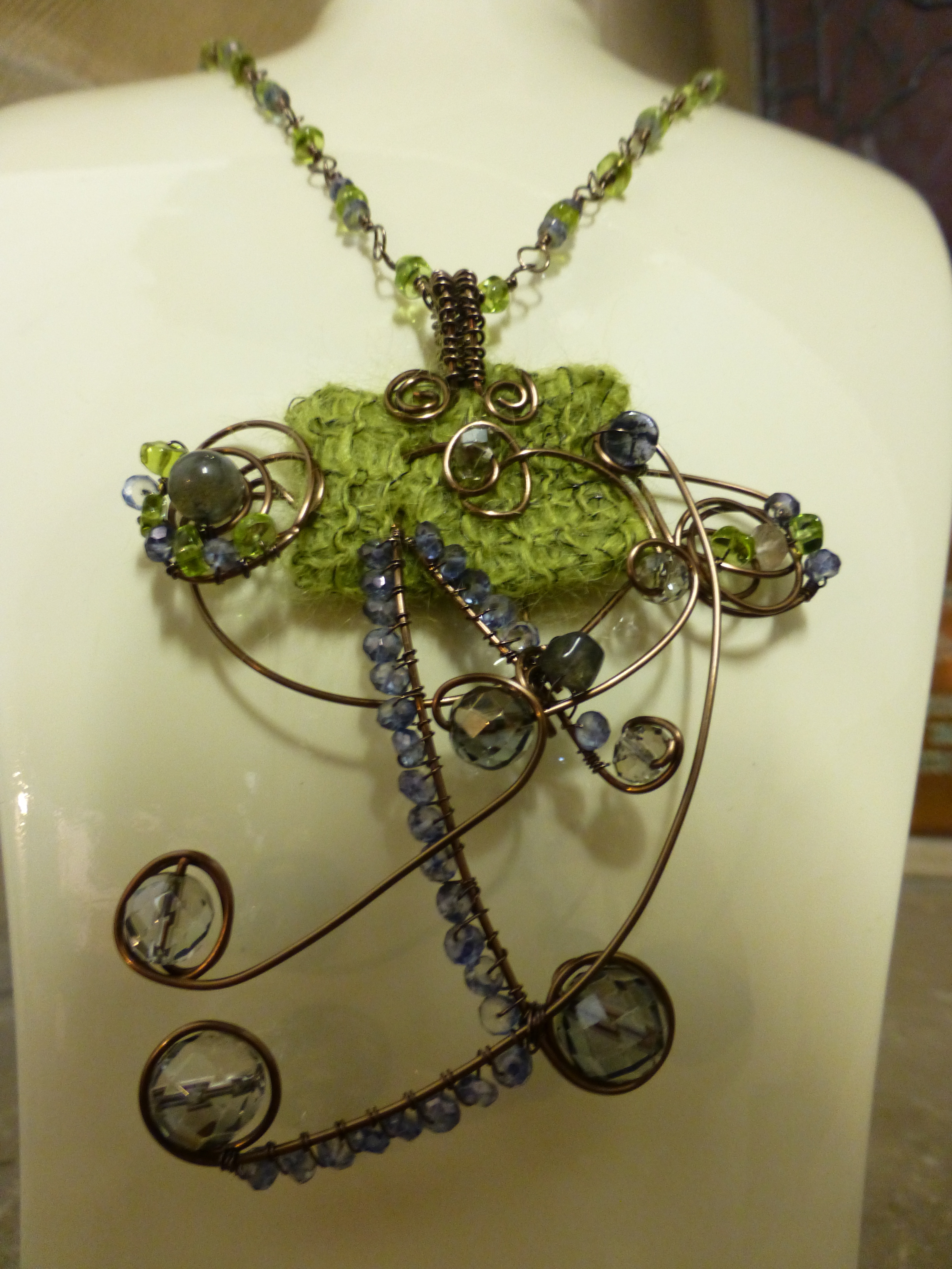 For ‘Tendrils and Spills’ based on ‘Waking the Well’, Sue wove green wool amongst peridots and iolites. It really looks like the poem.
