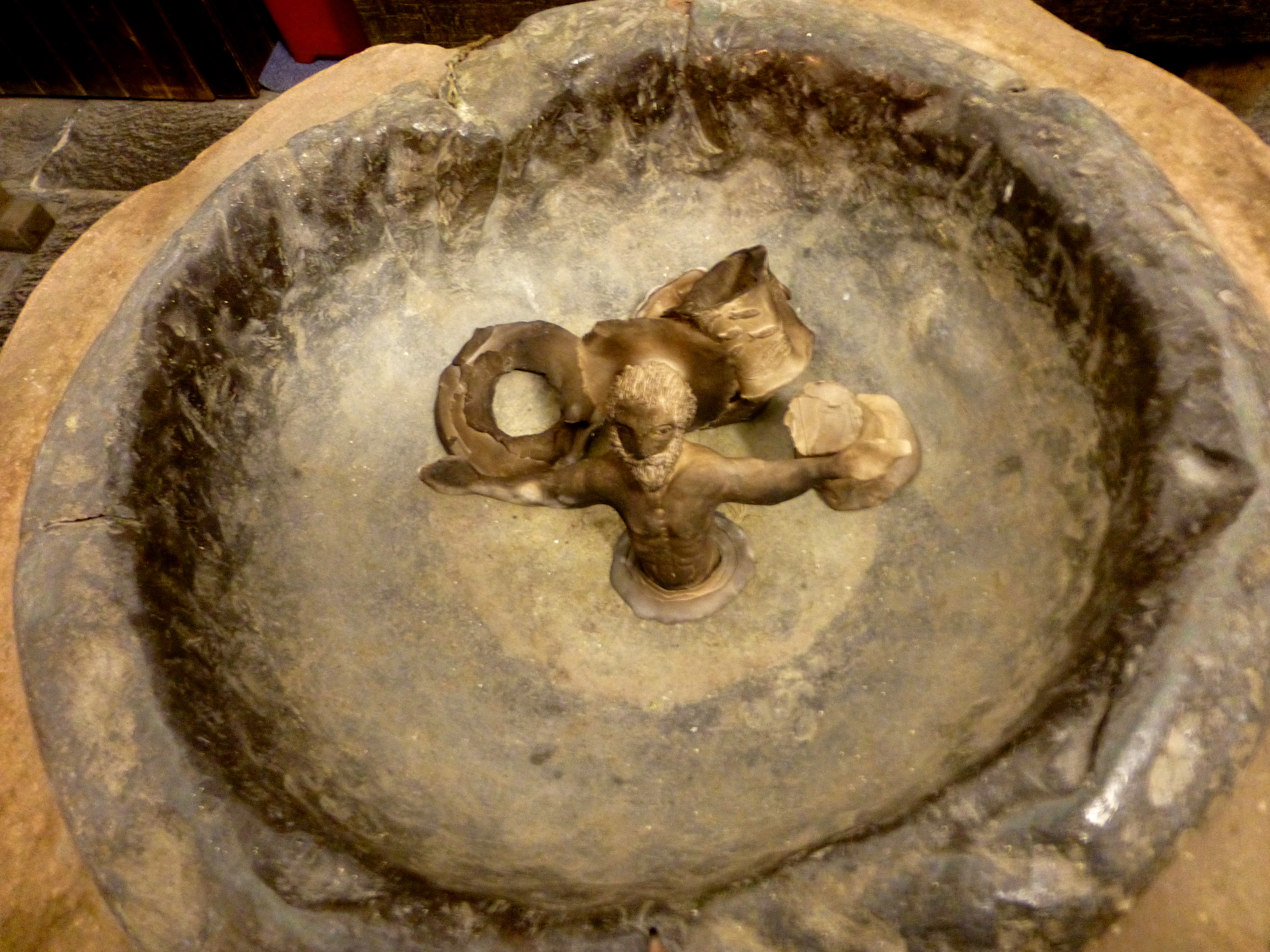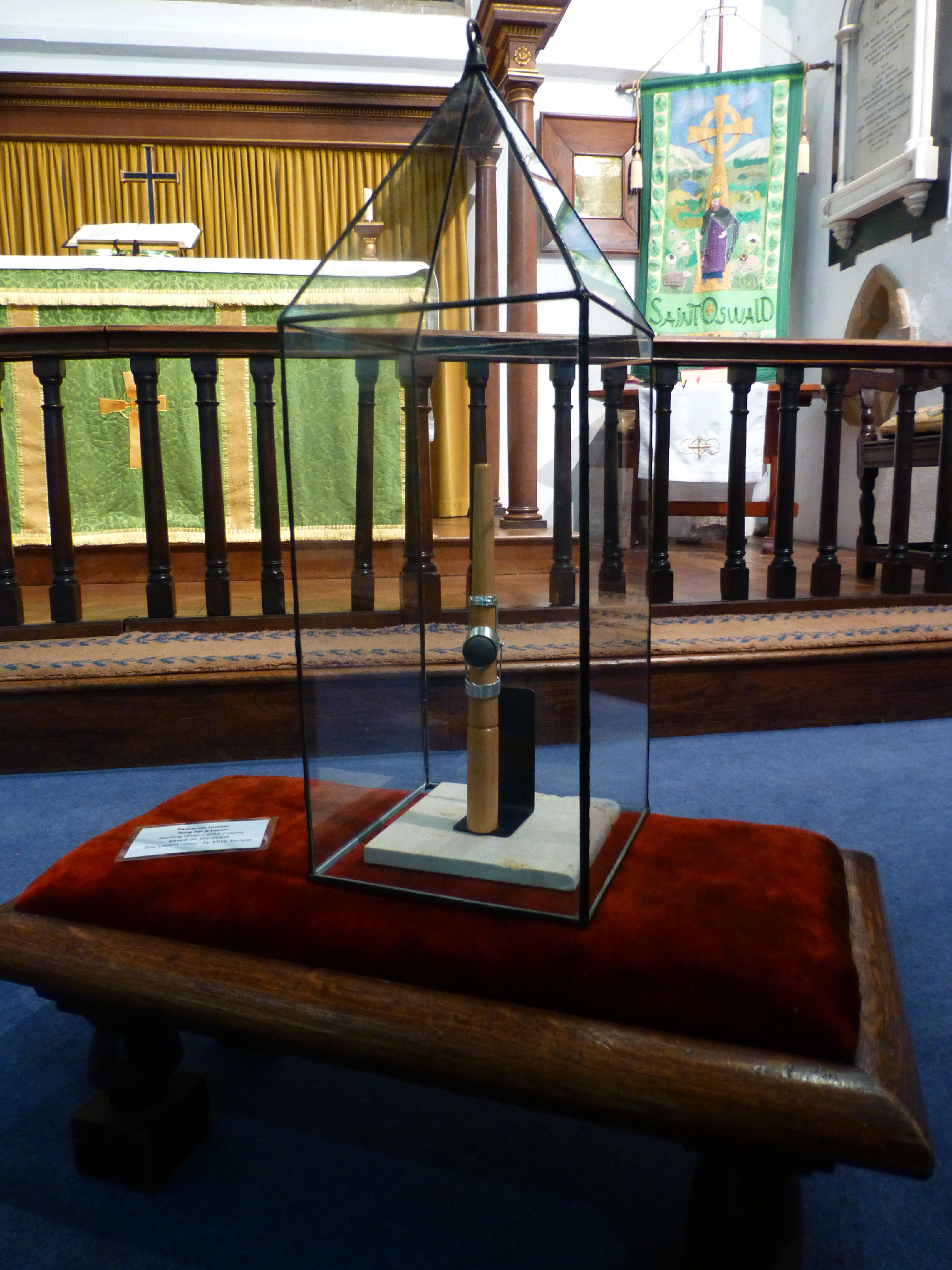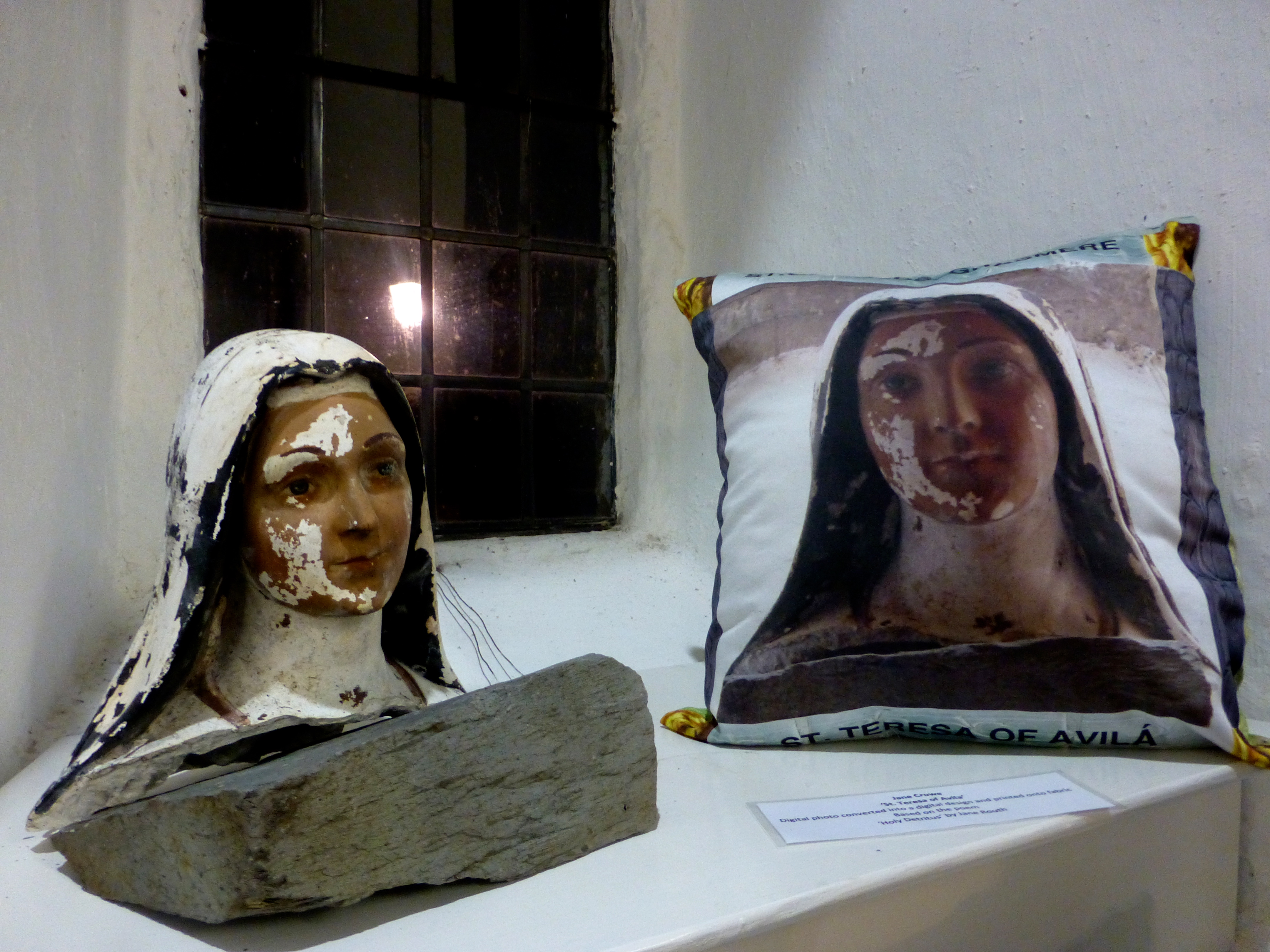 St. Teresa of Avila’s head (long story) had been moved from its normal position in the Langdale aisle, to sit next to Jane Crowe’s textile responses to Jane Routh’s poem ‘Holy Detritus’ (from which the exhibition name was taken), and some C17th pew-ends that appear in the poem.